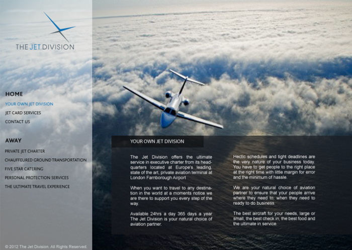 A website created and produced for The Jet Division, a private jet company based in the US.